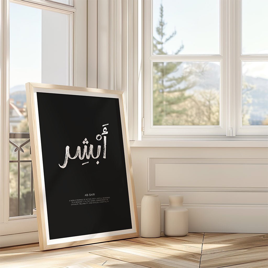 Celebrate the heart of Arabian generosity with this elegant typography print featuring the word "Ab-shir" in bold, textured Arabic calligraphy. More than just a word, "Ab-shir" is a noble promise of action and a joyful response to a request. It serves as the verbal embodiment of chivalry, reliability, and the world-renowned Khaleeji hospitality. This minimalist black-and-white design distills a powerful cultural sentiment into a sophisticated work of modern art.