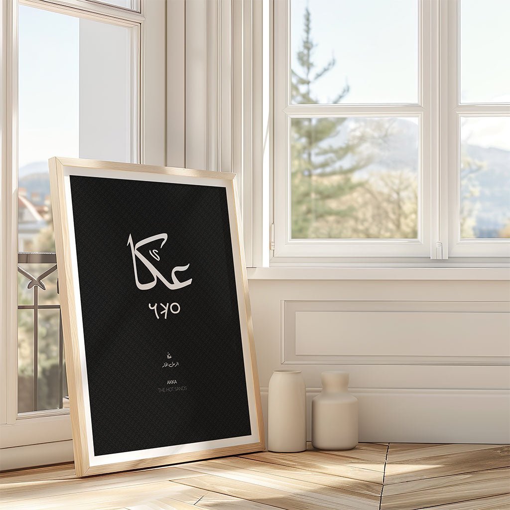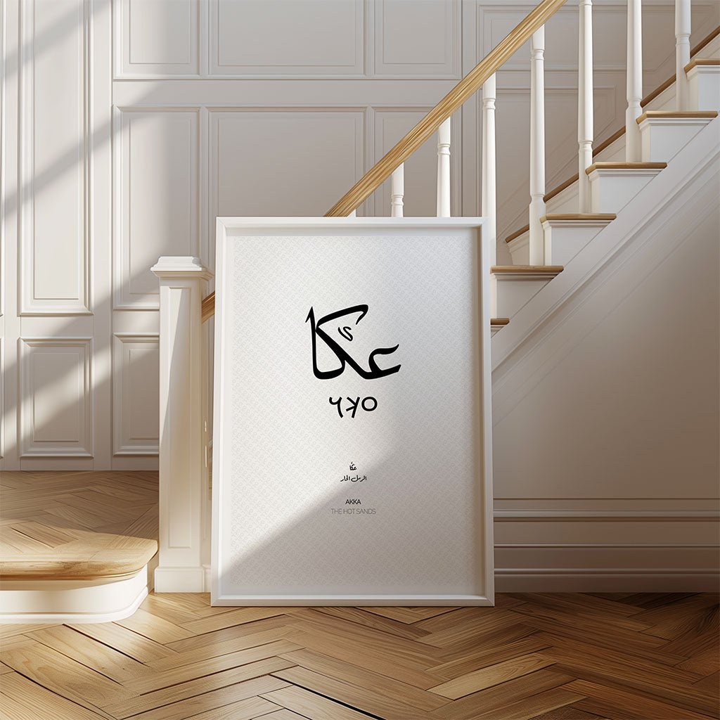 Perfect for those seeking meaningful Islamic wall art, Arabic typography, or heritage-inspired decor, this print is designed to create a focal point of quiet strength. The clean, monochrome aesthetic allows the intricate linework of the calligraphy to take centre stage, making it a versatile addition to a living room, hallway, or creative studio. Whether you have personal roots in Akka (عكا), Palestine (فلسطين) or simply admire the rich tapestry of Middle Eastern history, this artwork brings a sense of grounded identity and timeless beauty to your space.