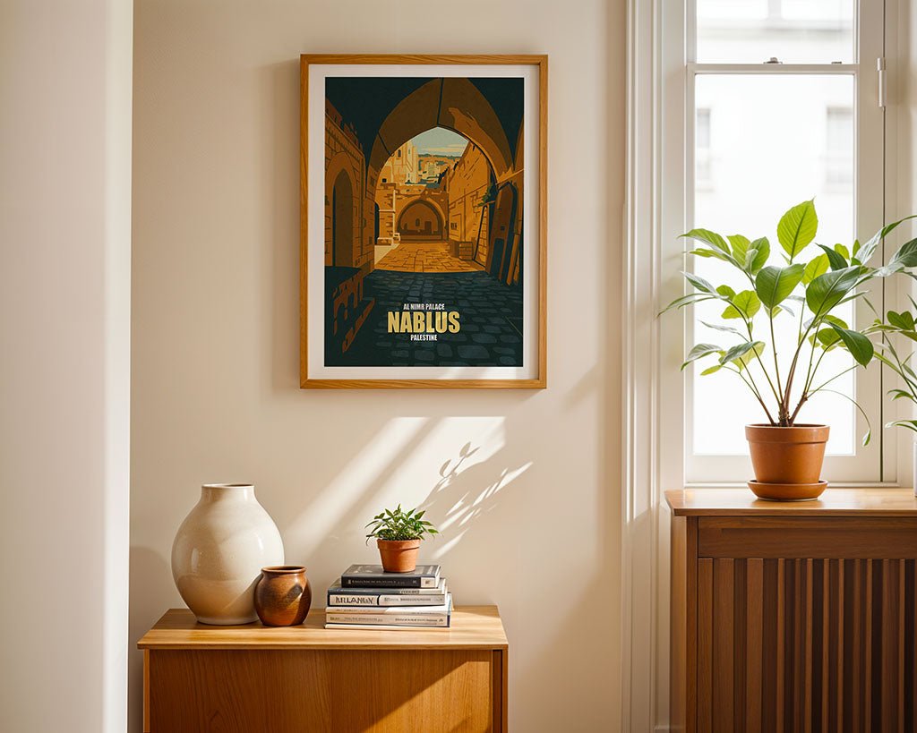 Golden morning light pours through the vaulted passage of Al Nimr Palace (قصر النمر) in the Old City of Nablus, casting long shadows across worn stone. This vintage travel artwork frames arches, balconies and cobbles in warm ochre tones, drawing the eye toward the heart of the souk. It’s a quietly powerful statement of place, Nablus wall art with heritage, texture and depth for homes and studios that value culture over noise.