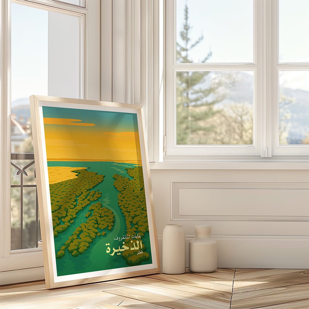 Designed in a nostalgic retro vintage style poster aesthetic, this piece brings a bold pop of colour and story to your wall. The contrast between emerald green mangroves and a golden hued sky evokes the stillness of early morning kayak rides, birdwatching trips, and slow, thoughtful days by the water. It’s perfect for nature lovers, Qatar residents, or anyone craving a window into one of the country’s most beautiful and surprising landscapes.