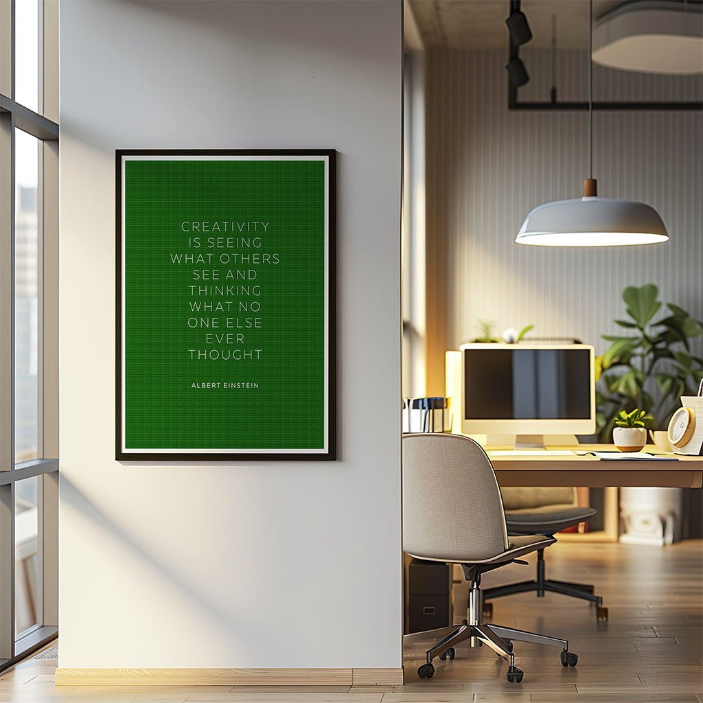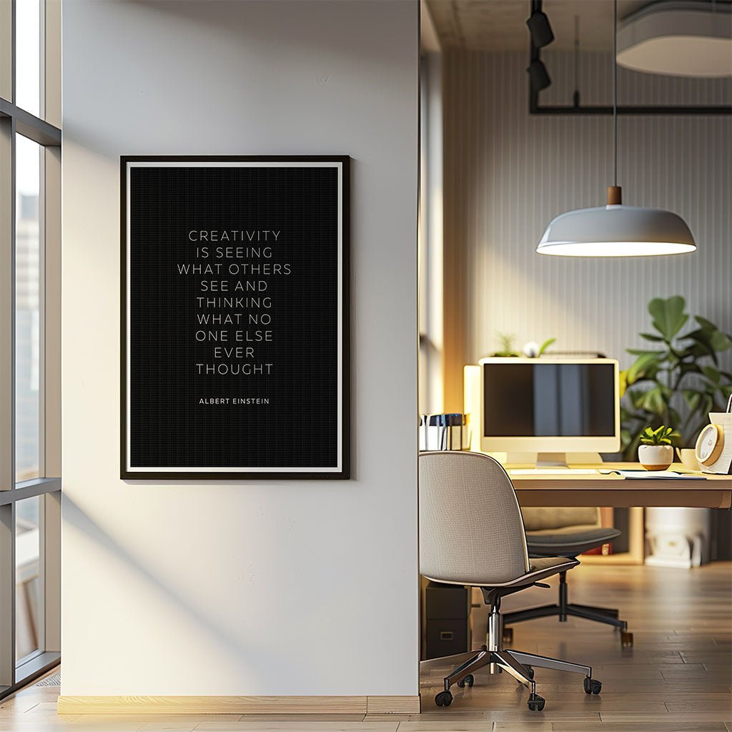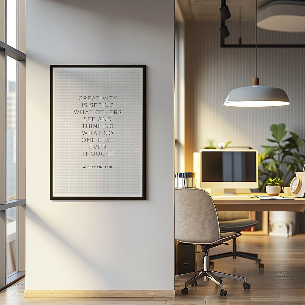 Inspire creativity and innovation in your space with the Albert Einstein quote art print. Featuring the thought-provoking words, “Creativity is seeing what others see and thinking what no one else ever thought,” this print serves as a daily reminder to approach the world with fresh eyes and an open mind. The minimalistic design, with clean text set against a textured background with "Creativity" running accross it, brings focus to the powerful message, making it perfect for creative spaces or offices.