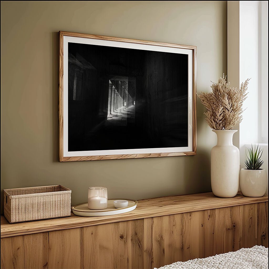 This dramatic print serves as a sophisticated focal point in any modern setting. Its monochromatic palette and high-contrast depth make it an ideal fit for Industrial, Minimalist, or Dark Academic interior styles. We recommend displaying this in a hallway, library, or entryway to create an immediate sense of grandeur and intrigue.