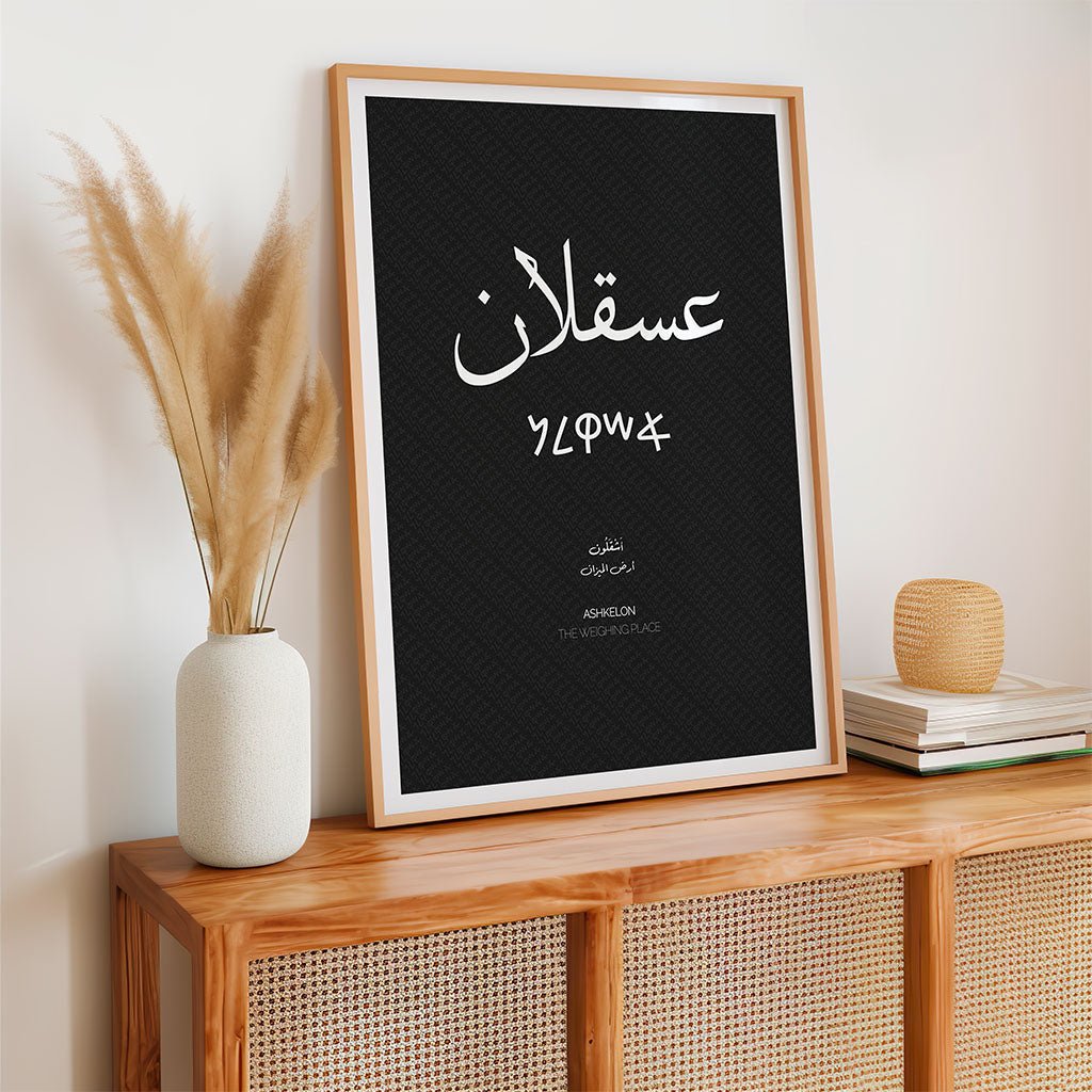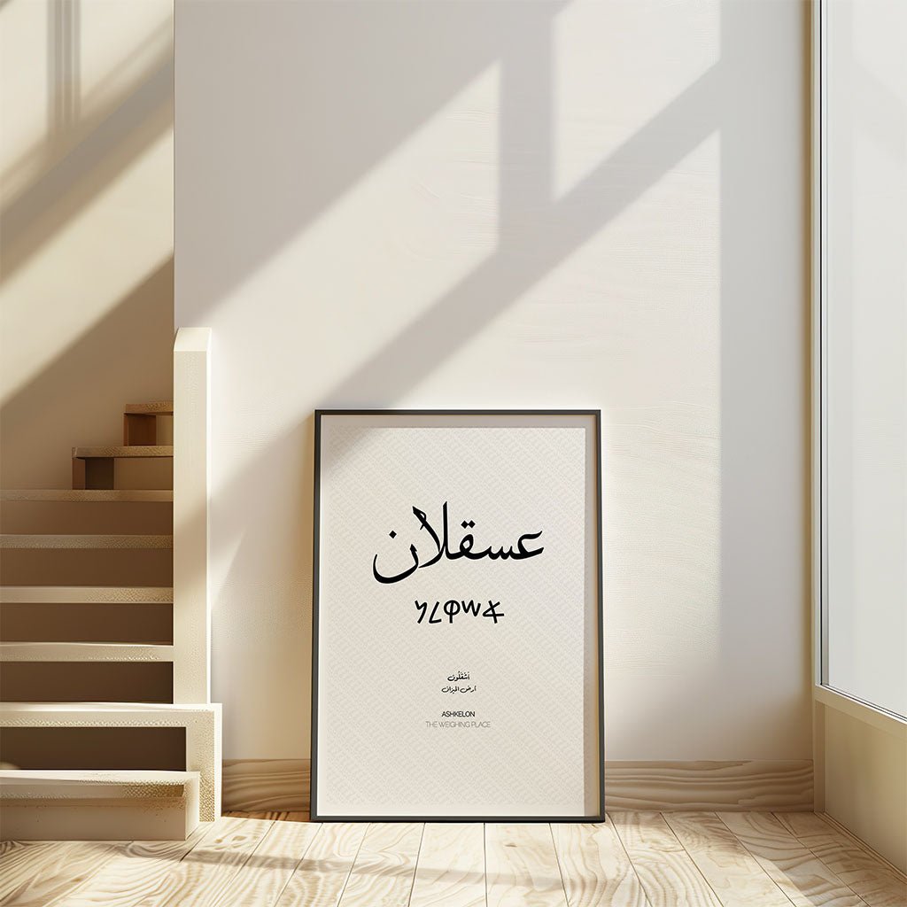 Printed on museum-quality archival paper using eco-friendly, non-toxic inks, this high-resolution print ensures that every delicate curve of the script remains sharp and vibrant for years to come. It makes a deeply thoughtful gift for housewarmings, weddings, or for anyone wishing to keep the spirit of Palestine (فلسطين) close to their heart. This typographical and linguistic masterpiece provides a sophisticated touch of cultural depth to your walls, celebrating the enduring legacy of Ashkelon with refined elegance