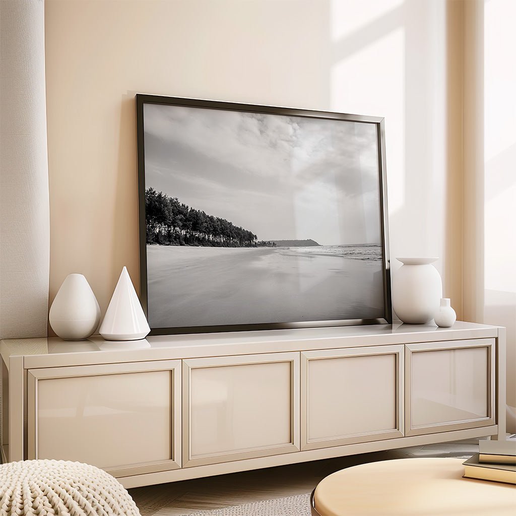 Embrace the timeless allure of the Indian coast with this breathtaking black and white photograph of a secluded beach in Goa. The image captures a vast, pristine shoreline where the soft sand meets the gentle roll of the Arabian Sea. A dramatic line of towering Casuarina trees borders the beach, their textured needles creating a rhythmic silhouette against a soft, expansive sky. This monochromatic masterpiece distills the vibrant energy of Goa into a moment of pure, cinematic stillness.