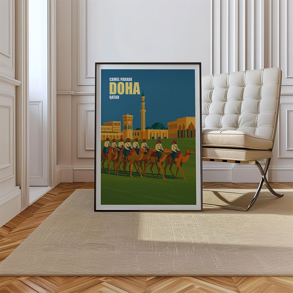 Bring a piece of Qatari tradition into your space with this bold retro vintage style Camel Parade in Doha (دوحة) poster. Featuring a vibrant caravan of riders on camelback crossing the green esplanade in front of Doha’s iconic skyline, this artwork captures a moment where cultural heritage meets modern city life.