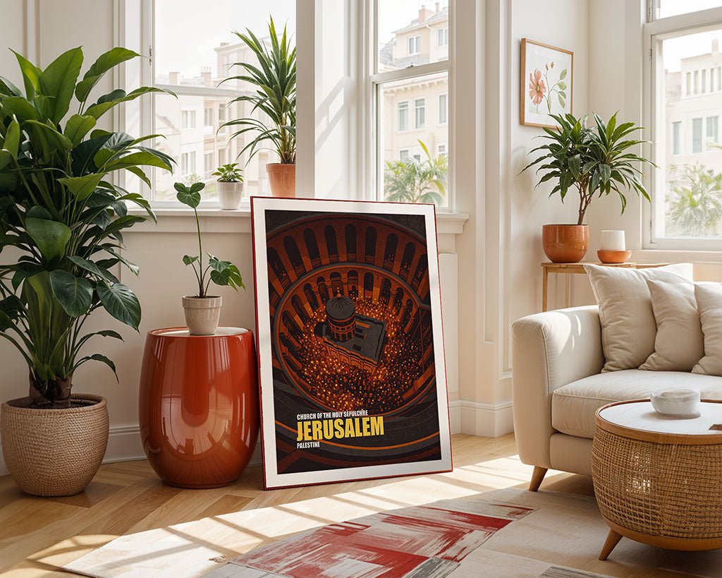 Printed on museum quality archival paper with non toxic, eco friendly inks, this Jerusalem poster delivers crisp detail and rich colour that endures. Sustainable packaging keeps your order protected, and multiple sizes make styling simple, choose a large format to anchor a feature wall or a smaller size to layer with our city maps and photography. Whether you seek a meaningful gift or you’re curating a gallery wall, this Church of the Holy Sepulchre print brings heritage, design clarity, and quiet ceremony into daily view. Add to cart and let Jerusalem’s light lead the room.