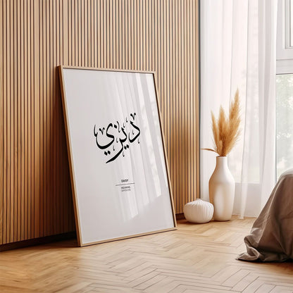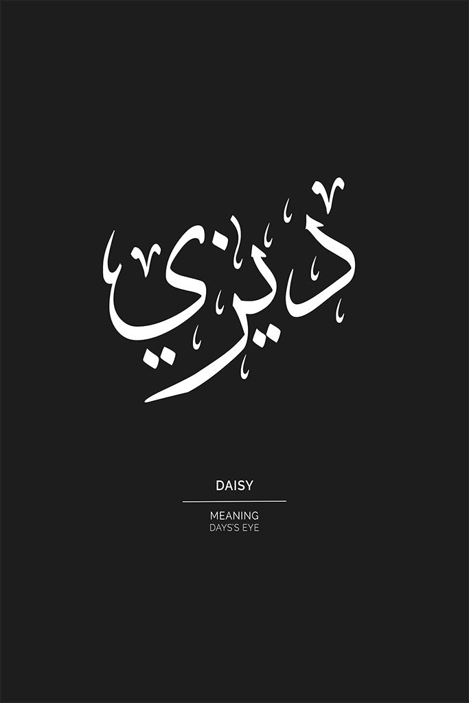 Brighten your space with this "Daisy" (ديزي) Arabic calligraphy wall art—a cheerful, modern piece that blends floral charm with cultural elegance. The name "Daisy," inspired by the flower symbolizing innocence and new beginnings, takes on a fresh new feel when written in flowing Arabic script. It’s a perfect choice for those who love delicate, light-hearted design with a personal touch.