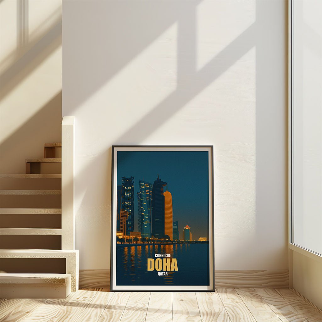 From the shimmering façade of the Burj Doha to the twisting form of the Tornado Tower, this print brings together some of the capital’s most recognisable buildings, painted in deep navy and golden hues. The waterfront promenade below, known as the Corniche, is lit gently by palm lined streetlights, creating a peaceful contrast to the vertical energy of the skyline.