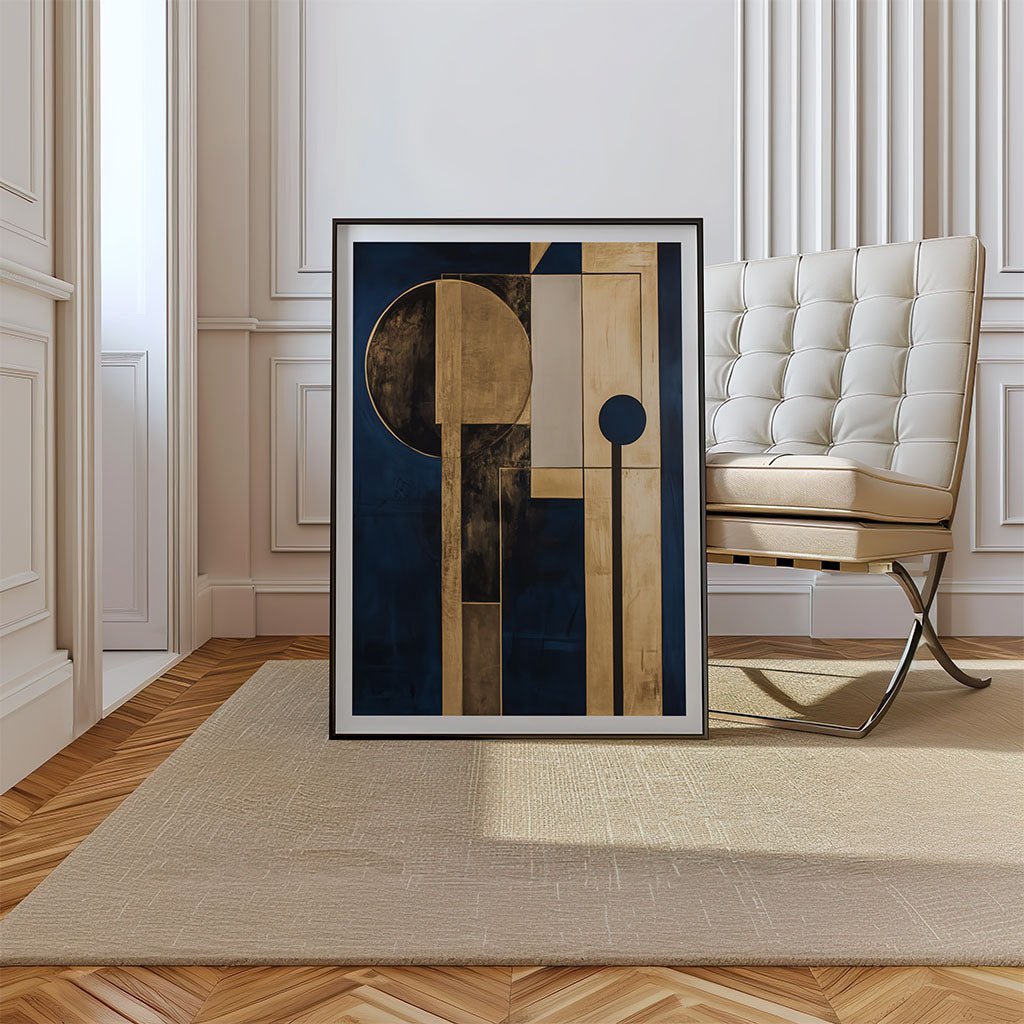 Perfect for those drawn to structured elegance, this wall art adds sophistication to corporate offices, luxury apartments, creative studios, and modern living rooms. The rich navy backdrop grounds the composition, while the metallic gold detailing catches light and elevates the room.