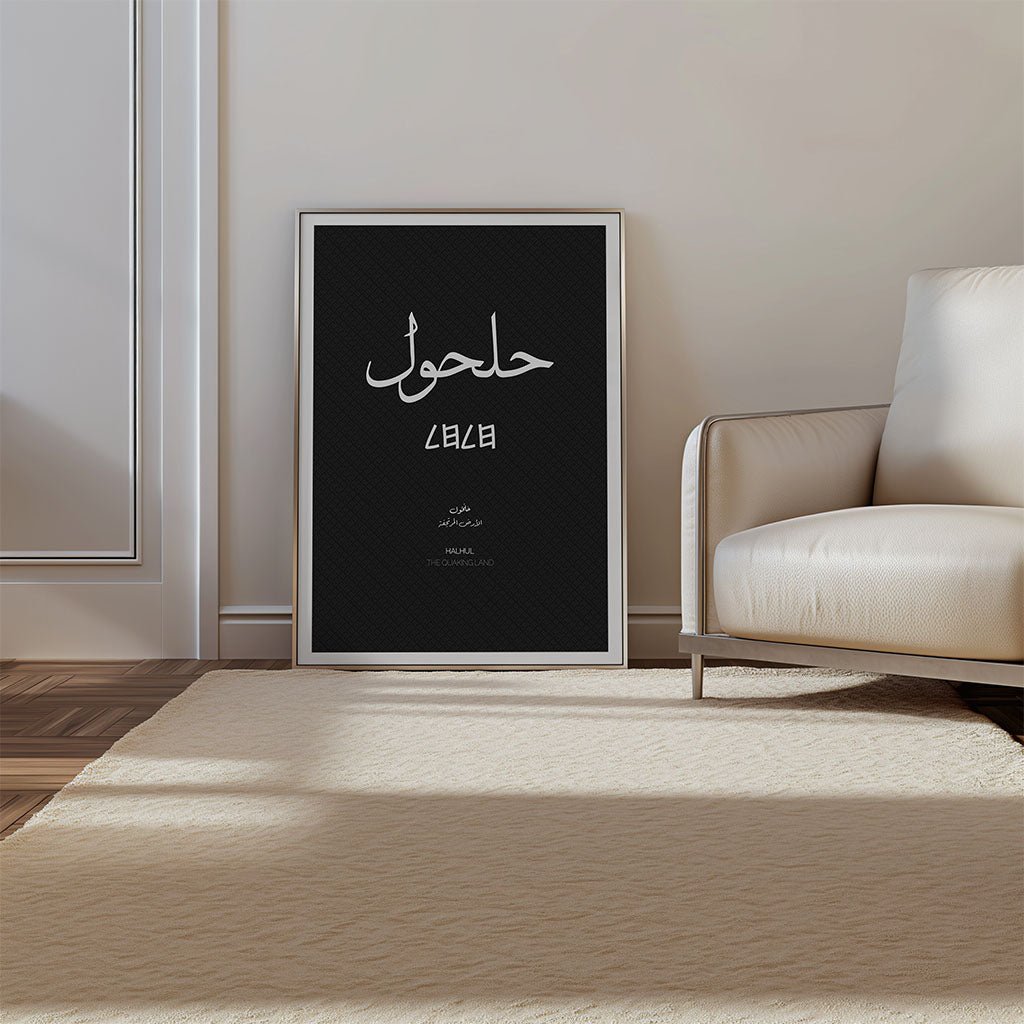 Perfect for those seeking Islamic wall art, Arabic typography, or heritage-inspired decor, this print is designed to create a focal point of quiet strength and historical depth. The clean, monochrome aesthetic against a subtly patterned background allows the intricate linework of the calligraphy to take centre stage, making it a versatile statement piece for a living room, study, or creative studio. Whether you have personal roots in Halhul (حلحول), Palestine (فلسطين) or simply admire the deep-seated history and resilience of the region, this artwork brings a sense of grounded identity and timeless beauty to your space.