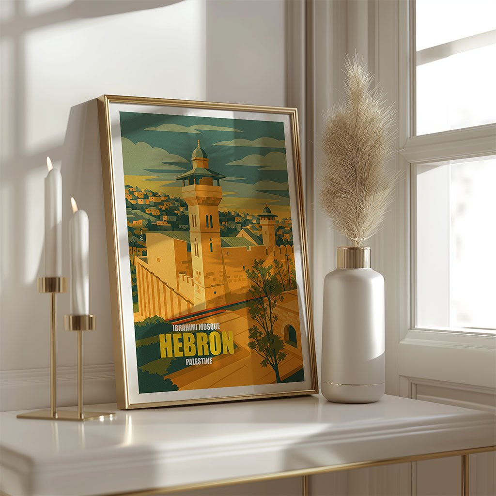 Golden light climbs the stone walls of the Ibrahimi Mosque (الحرم الإبراهيمي) set above the hills of Hebron (الخليل), Palestine (فلسطين). This vintage travel poster distils arches, towers, and ramparts into warm ochre planes with soft green shadows, giving your room a calm focal point with real heritage. The composition leads the eye along the fortified wall to the minaret and across the old city, capturing a landmark that holds faith, history, and design in one frame. For lovers of Islamic architecture, Holy Land sites, and Middle East wall art, this Hebron print brings place, depth, and quiet strength to your space.