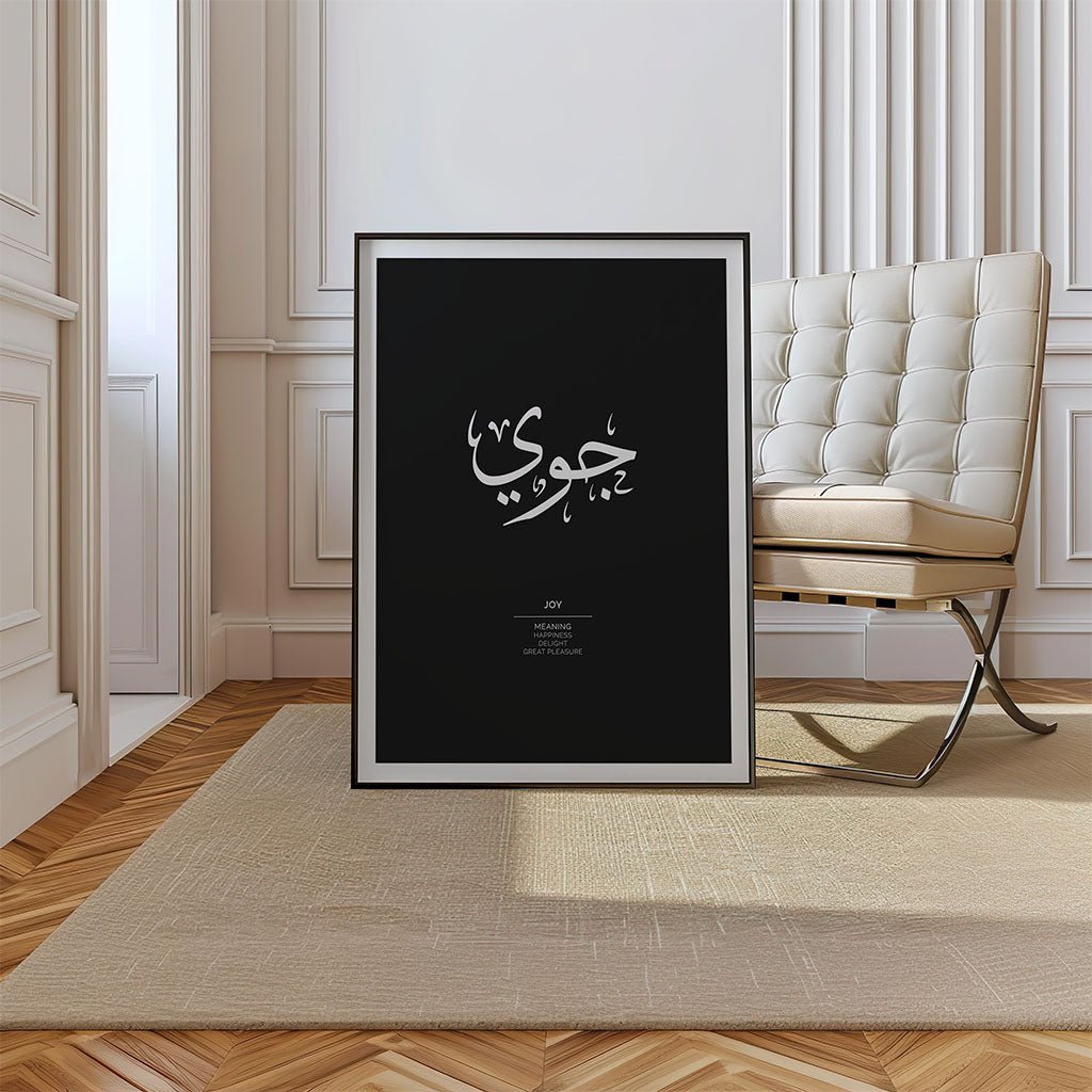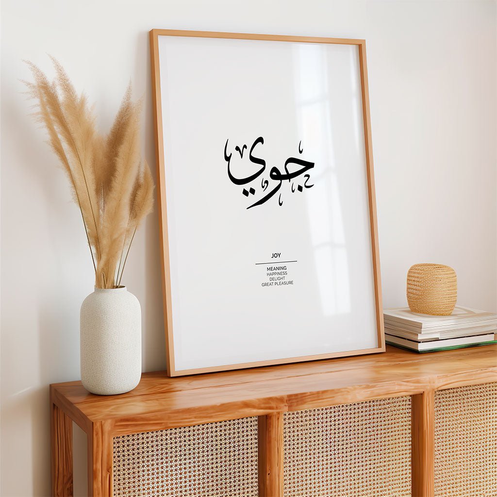 Bring home a daily reminder of happiness with this elegant Arabic calligraphy print of Joy (جوي). Designed for those who carry light, laughter, and emotional depth, this piece captures more than a name, it’s an affirmation. In Arabic, جوي carries meanings tied to joy, delight, and deep pleasure, making it perfect for brightening up modern interiors.