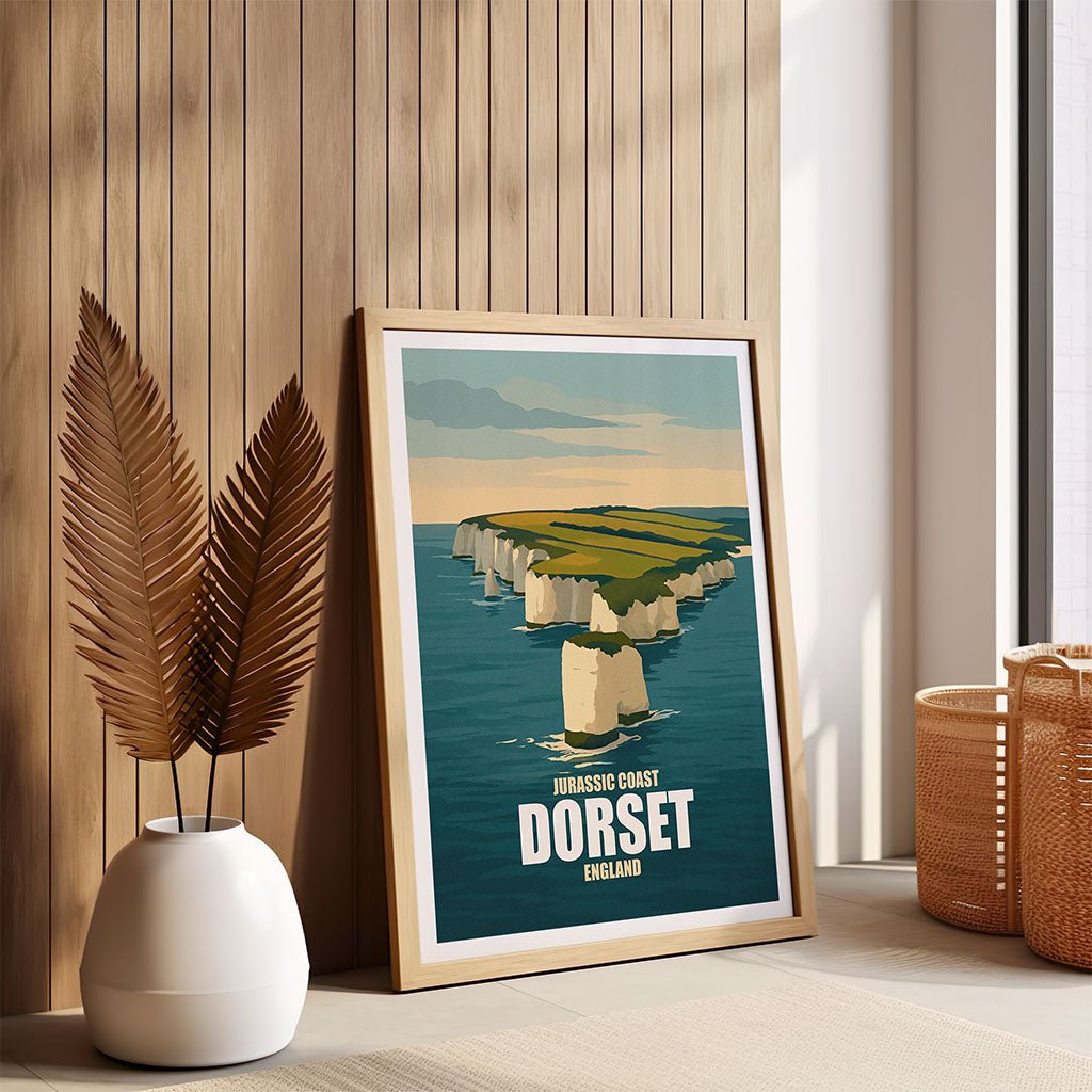 Step back in time with this striking retro poster of the Jurassic Coast, Dorset’s UNESCO World Heritage shoreline. Featuring the dramatic chalk stacks of Old Harry Rocks, this vintage style artwork celebrates one of England’s most iconic coastal formations.