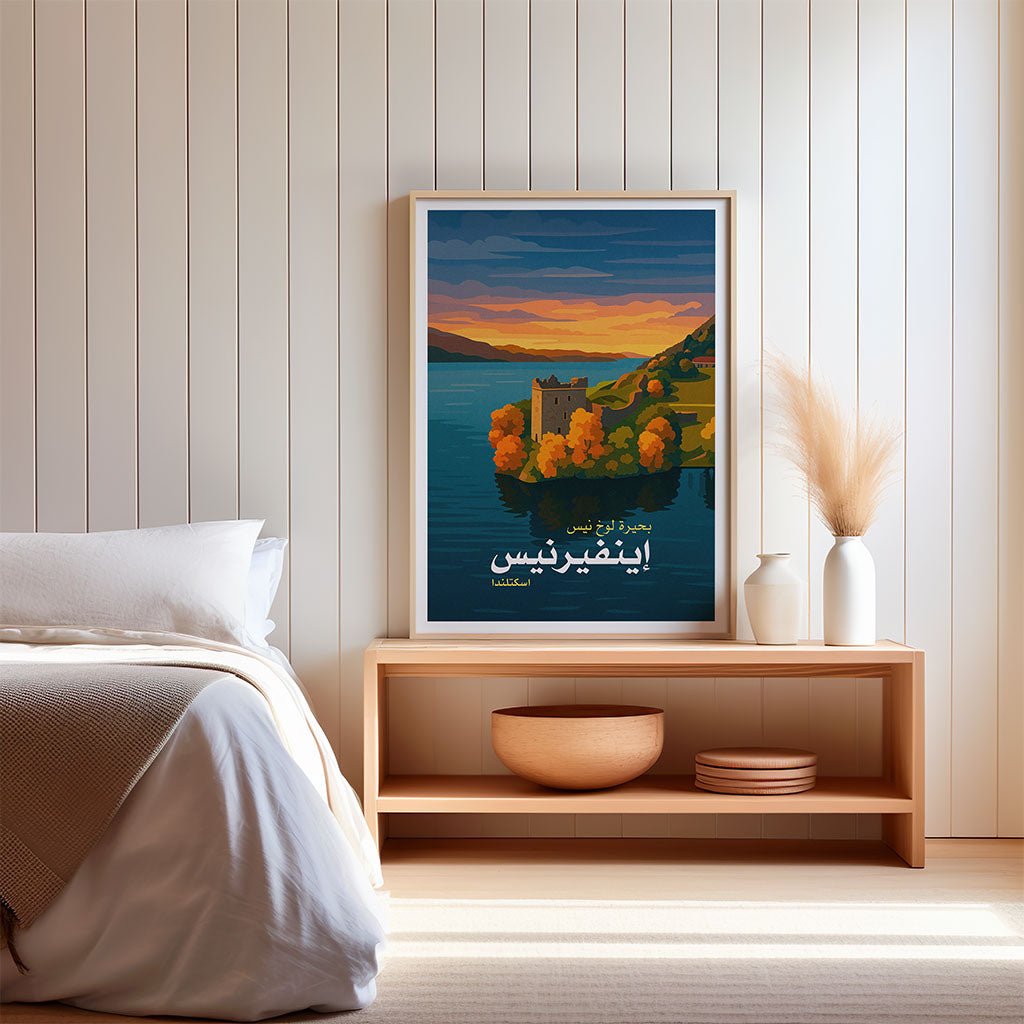 Step into the mystery and majesty of Loch Ness with this bold retro-style travel poster featuring Urquhart Castle at sunset. Set near Inverness, this Scottish landmark is steeped in history, folklore, and untamed beauty captured here in vibrant autumn tones and stylised 1950s design.