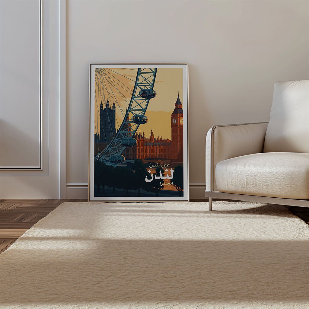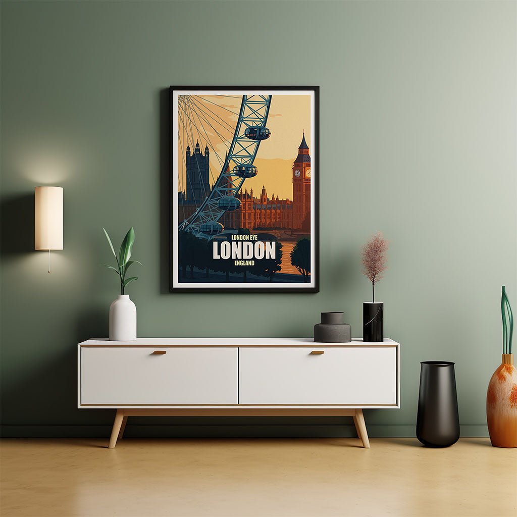 Designed in a retro vintage inspired illustration style, this poster brings architectural landmarks and modern engineering together. The London Eye’s sweeping ferris wheel arcs across the composition, framing the historic skyline in a beautiful juxtaposition of old and new. Perfectly balanced and rich in colour, this piece invites you into that classic London moment where history, innovation, and beauty intersect.