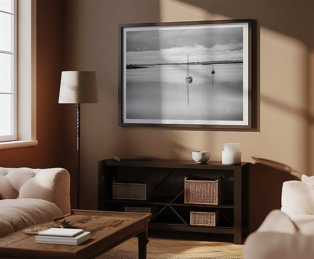 Capture the quiet, misty soul of the Irish midlands with this evocative black and white photograph of Lough Derg. The image features a solitary sailboat resting on glassy, mirror-like waters, its mast creating a sharp vertical contrast against the soft, expansive horizon. Beneath a dramatic canopy of rolling clouds, the stillness of the lake evokes a profound sense of peace and the timeless beauty of Ireland's historic waterways.