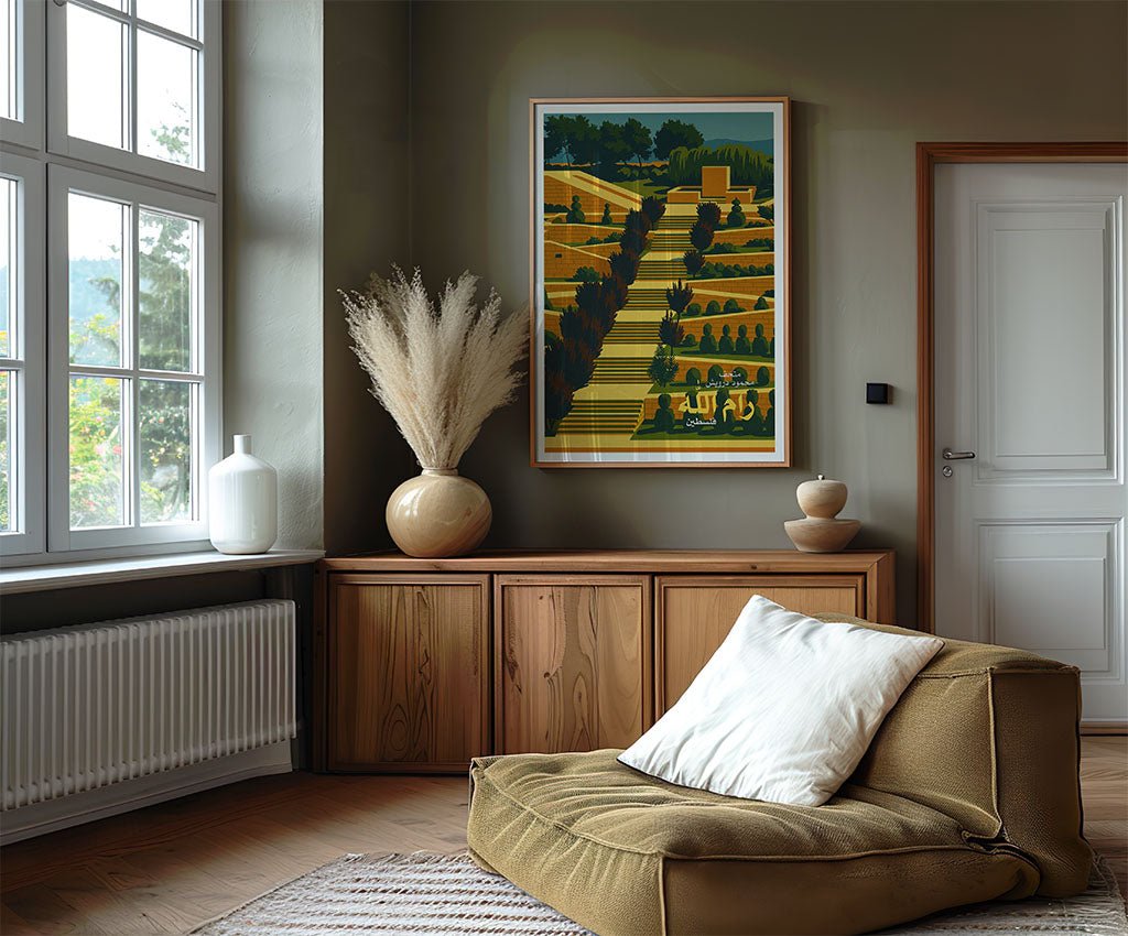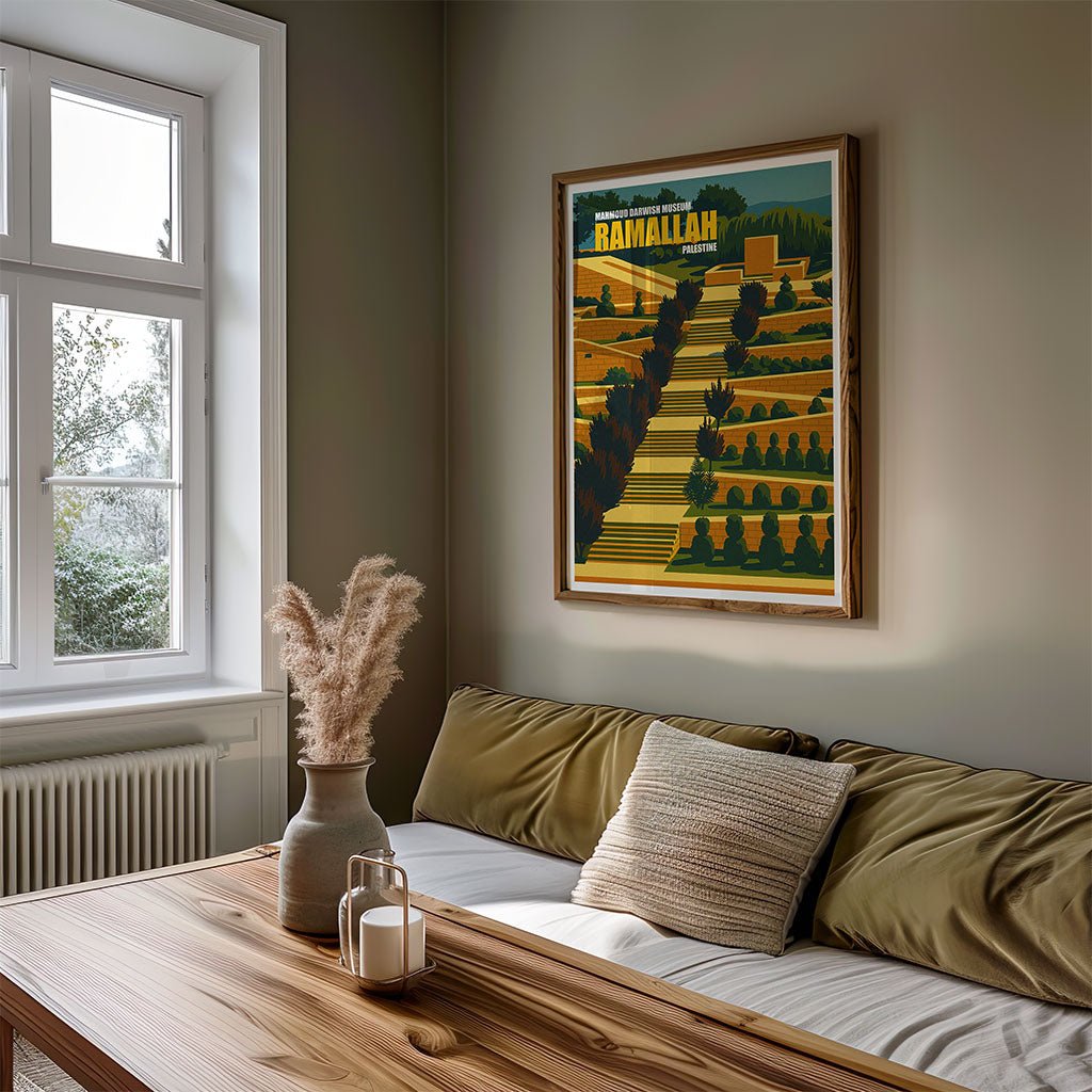 Stone terraces step up the hillside towards the clean lines of the Mahmoud Darwish Museum (متحف محمود درويش) in Ramallah (رام الله), set against olive trees and soft evening tones. This vintage travel poster distils the site’s layered gardens into warm ochre planes and deep green shade, creating a calm rhythm that suits modern interiors. It speaks to lovers of literature, architecture, and Middle East design, wall art that honours Palestine (فلسطين) and the voice of its celebrated poet without clutter or noise. Use it to anchor a living room, study, or hallway.