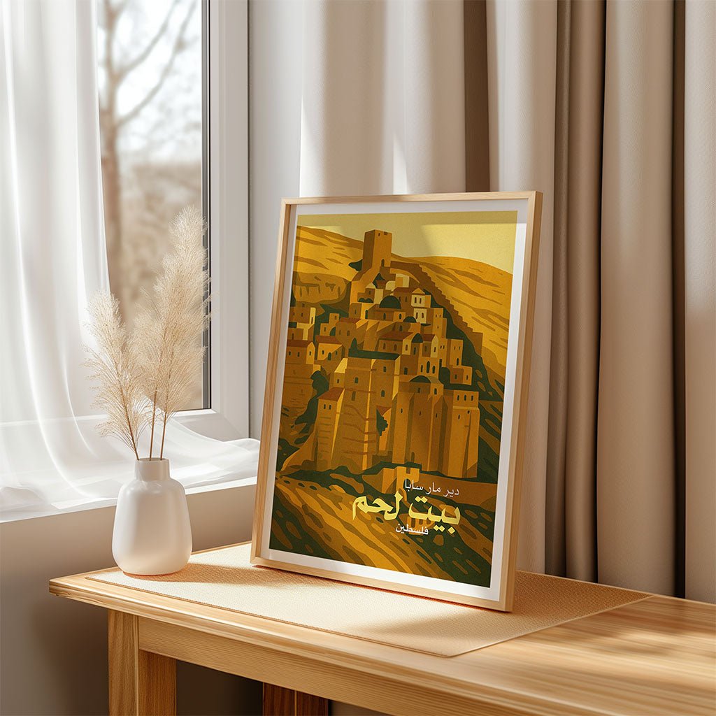 We print on museum quality archival paper with non toxic inks and pack each order in sustainable materials, so colour stays rich and detail stays crisp. Sizes range from small to statement large, making styling simple for living rooms, studies, hallways, and hospitality spaces. Gift it to a pilgrim, an architecture lover, or anyone building a thoughtful collection of vintage travel posters and Middle East art prints. Add to cart and bring Bethlehem (بيت لحم، فلسطين) into daily view.