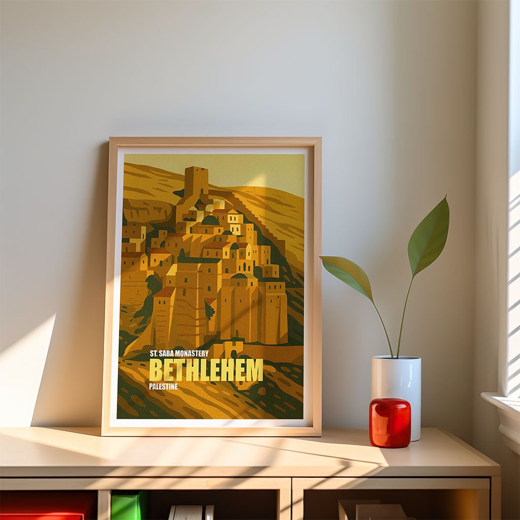 Stone terraces cling to the cliffs as Mar Saba (St Saba) Monastery (دير مار سابا) steps down the desert valley east of Bethlehem. This vintage travel poster captures the monastery’s domes, towers, and sand-washed walls in warm ochre layers, giving your room a calm focal point with real heritage. If you love architecture, sacred sites, and Middle East landscapes, this Bethlehem wall art delivers story, place, and depth. It pairs well with natural wood, linen textures, and matte frames, and anchors gallery walls with ease. Keywords woven for search include Mar Saba Monastery poster, Bethlehem wall art print, Palestine travel poster, Holy Land wall decor, and desert monastery artwork.