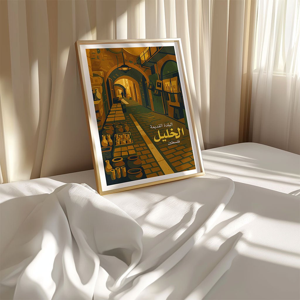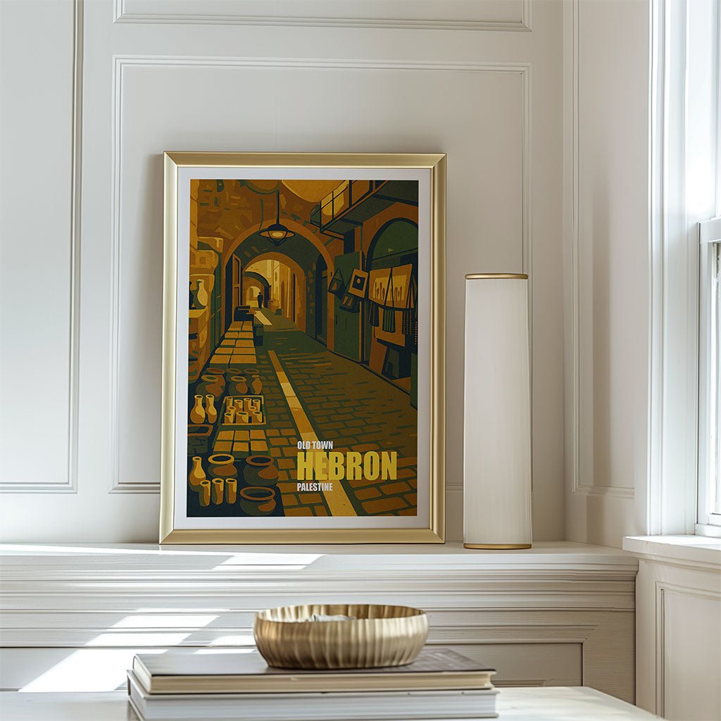 Stone arches frame a narrow souk as pottery, prints, and lanterns line the cobbled lane of Old Town Hebron (الخليل). Warm ochre blocks, deep olive shadows, and a long sweep of perspective draw the eye toward the figure at the far arch, giving your room a sense of depth and place. This vintage style travel poster suits collectors of Palestine wall art, Middle East decor, and retro city prints. Hang it in a living room, study, or hallway to anchor a gallery wall with culture, texture, and quiet movement.