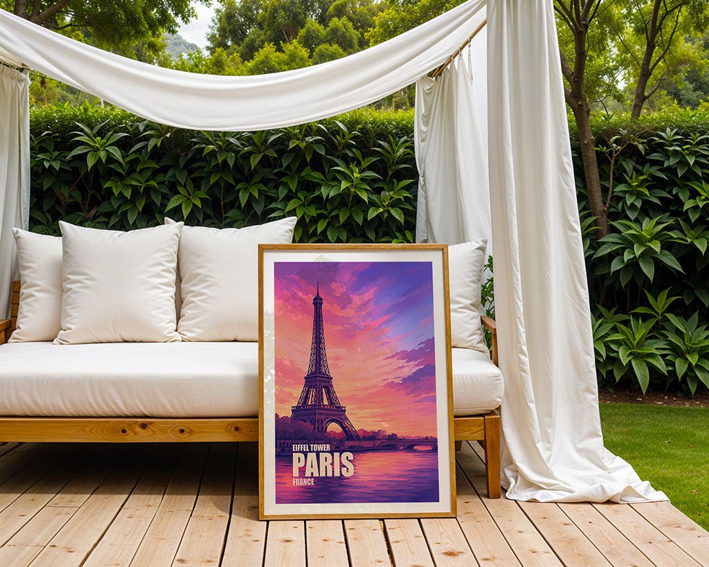Let the magic of برج إيفل (Eiffel Tower), باريس (Paris), فرنسا (France) sweep through your space with this vibrant sunset art print. The sky erupts in brilliant shades of violet, rose, and orange, casting the Eiffel Tower in an ethereal glow beside the River Seine. This artwork captures the breathtaking romance of a Parisian evening—ideal for lovers of France, dreamers, and design enthusiasts who crave a bold yet poetic statement piece.