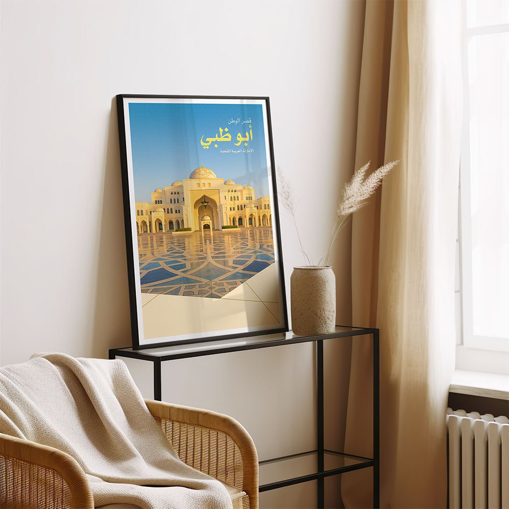 Graceful, grand, and glowing in morning light, this Abu Dhabi wall art captures Qasr Al Watan’s (قصر الوطن) regal symmetry and awe-inspiring design. From the ornate domes to the perfectly mirrored tiles, every detail invites you to pause and admire the harmony of Islamic geometry and modern majesty. This artwork isn’t just decor—it’s a portal into cultural pride and architectural brilliance.