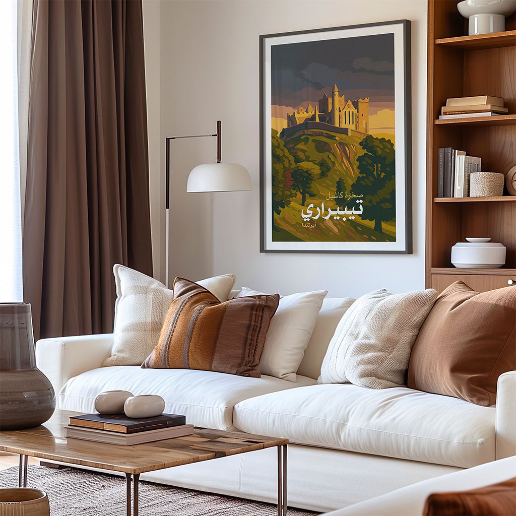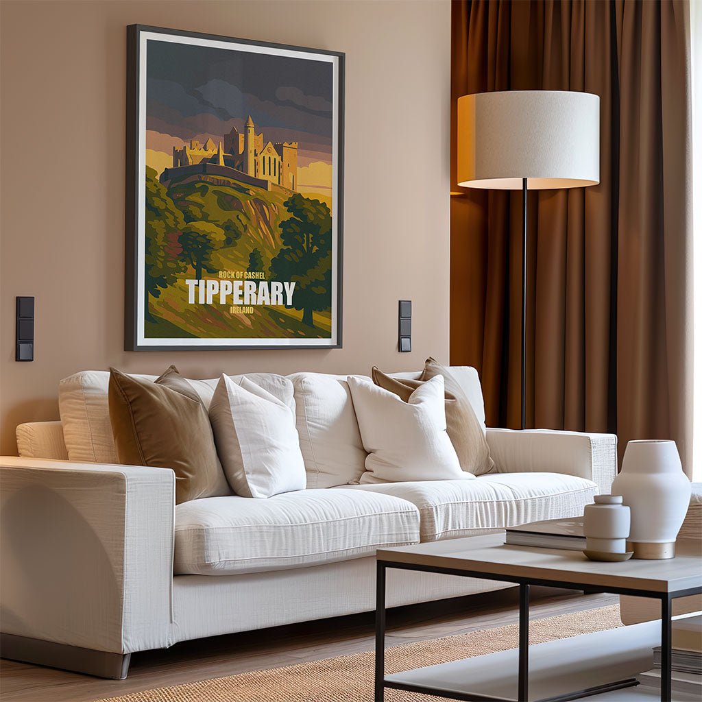 Capture the magic of Irish heritage with this striking Tipperary wall art print, featuring the iconic Rock of Cashel. Bathed in rich sunset tones of ochre, forest green, and violet grey, this vintage style poster transforms one of Ireland’s most legendary landmarks into a timeless piece of wall decor.