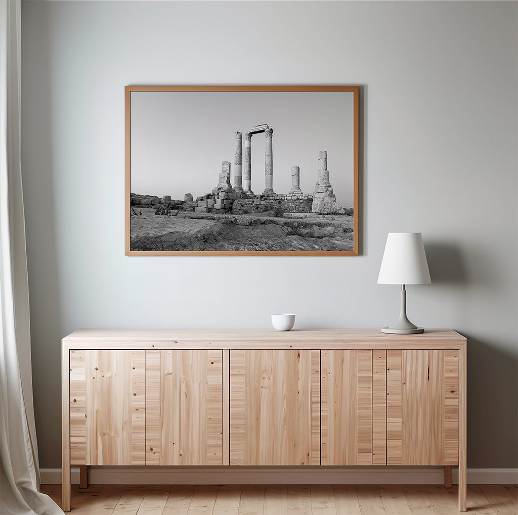 Transport your space to the heart of history with this powerful black and white photograph of the Temple of Hercules at the Amman Citadel. The image captures the enduring strength of Roman engineering, featuring the iconic towering columns and weathered stone lintels against a clean, expansive Jordanian sky. The high-contrast monochromatic finish emphasizes the raw texture of the ancient limestone and the architectural grandeur of one of the world's oldest continuously inhabited places.