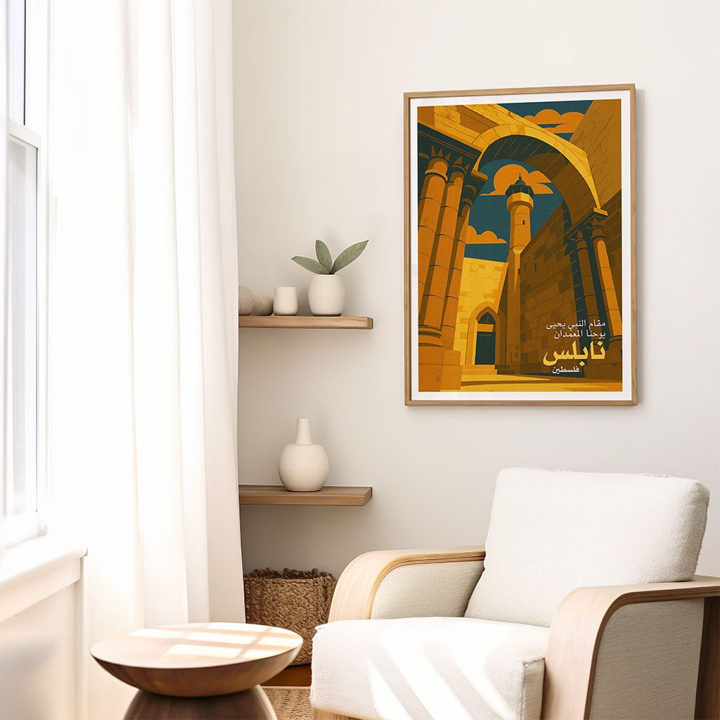 Stone arches rise toward a slender minaret as late light washes the courtyard of the Shrine of the Prophet John the Baptist (مقام النبي يحيى) in Nablus. This vintage travel poster pares the scene to warm ochre planes and deep teal shade, creating a strong architectural rhythm and a clear focal point. It brings heritage and place into view: Nablus wall art that suits living rooms, studies, hallways, and hospitality spaces. If you collect Middle East prints, Islamic architecture artwork, or retro travel posters, this piece anchors a gallery wall with culture and calm design.