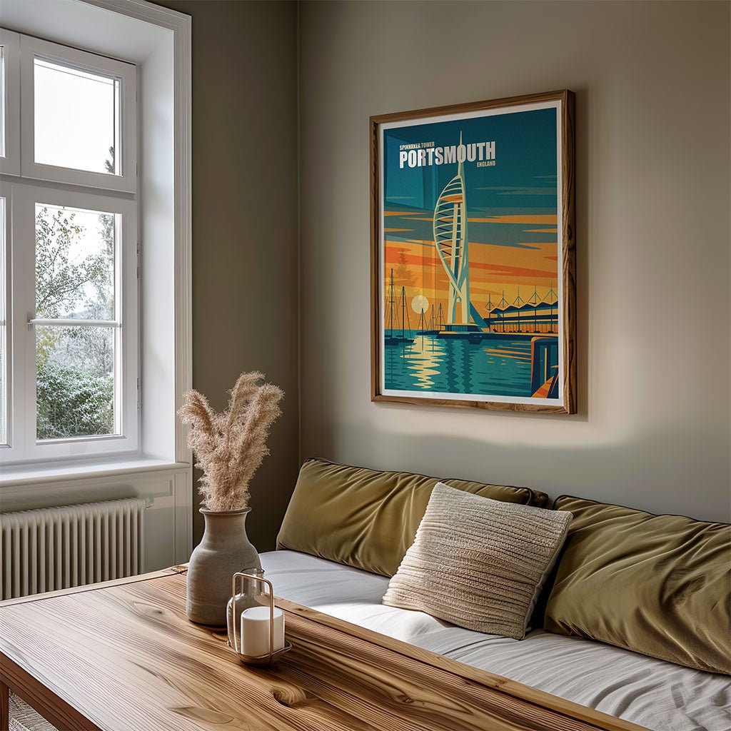 Celebrate Britain’s maritime spirit with this stunning Portsmouth wall art print featuring the iconic Spinnaker Tower. Designed in bold retro tones of navy, orange, and cream, this poster captures the elegance and energy of the South Coast’s skyline at sunset.