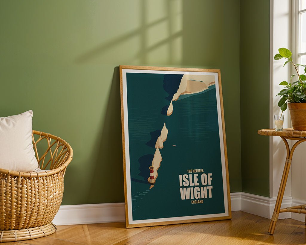 Bold, minimal, and instantly recognisable, this Isle of Wight wall art captures the striking chalk stacks of The Needles rising from the turquoise waters of the English Channel. With its rich teal sea and sharp white cliffs, the poster’s clean lines and vintage style evoke classic 20th-century travel prints, reimagined for modern interiors.