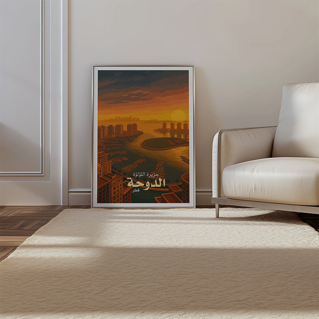 Bathed in golden light and modern luxury, this retro vintage style art print captures the iconic The Pearl Qatar at sunset where the Arabian Gulf meets Doha’s (دوحة) skyline. From the elegant marinas to the palm lined promenades, this artwork offers a sweeping view of one of the country’s most exclusive destinations.