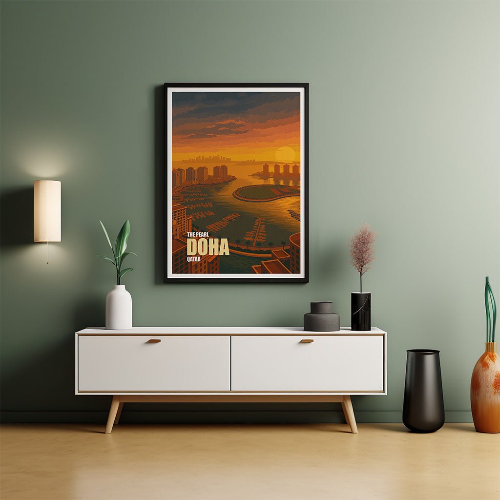 With its vibrant community, upscale lifestyle, and Mediterranean inspired architecture, The Pearl is more than a place it’s a statement. This retro vintage inspired print celebrates its charm with stylised boats, dramatic reflections, and a glowing Doha skyline in the background. Whether you’ve lived here, visited, or simply admire Qatari design, this artwork adds a sense of grandeur and nostalgia to your space.