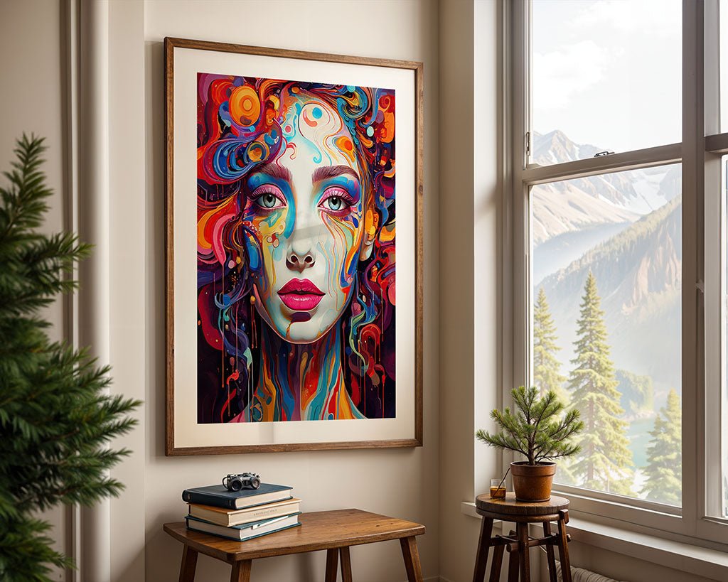"Whirlwind Woman" is our electrifying psychedelic digital painting that captures the essence of creativity and self-expression. In this mesmerising artwork, a woman gazes directly at the viewer, her striking features complemented by an extraordinary array of multicoloured psychedelic shapes and swirling patterns that form her hair, face, and neck.